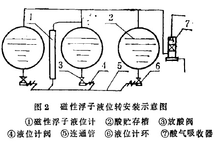 我廠頂裝式磁翻板液位計(jì)安裝,采用圖2的形式。三臺(tái)酸貯存槽②(三臺(tái)以上也可以)合用一臺(tái)液位計(jì),每臺(tái)酸槽的出口與液位計(jì),共連在一根連通管上⑤。要看某酸槽液位,開該酸槽通液位計(jì)的閥門④,液位即可醒目顯示。如此布置能節(jié)省兩臺(tái)液位計(jì),價(jià)值四千余元(酸貯存槽數(shù)量越多,節(jié)約效果越大)。此外,在安裝時(shí)要注意:裝大浮子時(shí)重端向上;裝液位標(biāo)計(jì)(小浮標(biāo))時(shí),紅色端向上,這樣可防止磁性相斥。裝完后用備用磁鋼,將小浮標(biāo)引到大浮子磁性材料處,顯示即可正常。目前頂裝式磁翻板液位計(jì)在我廠應(yīng)用情況良好。