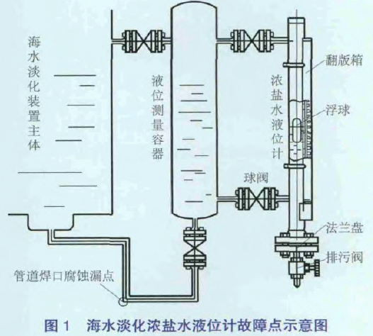 *鋼京唐鋼鐵公司帶熱壓縮器低溫多效蒸餾海水淡化的濃鹽水、蒸餾水及冷凝水液位測量都采用帶遠(yuǎn)傳的防腐磁翻板液位計(jì)。為了防止結(jié)垢,需在低溫的情況下讓海水達(dá)到沸點(diǎn),要求海水淡化裝置內(nèi)部處于負(fù)壓狀態(tài),正常運(yùn)行時(shí)為-0.093MPa左右?,F(xiàn)將磁翻板液位計(jì)在負(fù)壓狀態(tài)下發(fā)生管路漏氣的典型故障進(jìn)行分析。