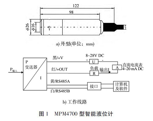 頂裝型磁翻板液位計以微處理器為核心單元,具有檢測、判斷和信息處理功能。其測量水位的基本原理是利用半導(dǎo)體硅材料的壓阻效應(yīng),實現(xiàn)液位壓力與電信號的轉(zhuǎn)換[2]。即把與液體深度成正比的液體靜壓力,通過液位計( 變送器) 轉(zhuǎn)換成電流信號輸出,從而建立輸出電信號與液體深度的線性對應(yīng)關(guān)系,實現(xiàn)對液位( 水位) 的測量。沉箱水位監(jiān)測選用MPM4700 型頂裝型磁翻板液位計,該液位計以擴(kuò)散硅壓阻式傳感器為管芯,集成變換器電路、微處理芯片為一體,其性能穩(wěn)定,結(jié)構(gòu)緊湊,外圍線路簡單。該液位計為四線制,可同時輸出一組4 ~ 20 mA 的標(biāo)準(zhǔn)電流信號和RS486 數(shù)字信號。MPM4700 型智能