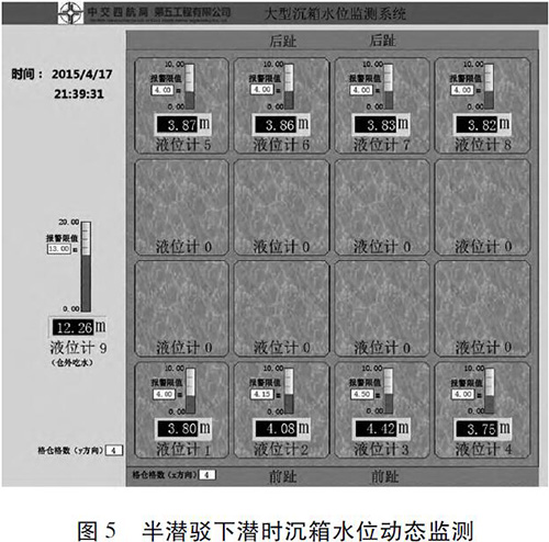漳州后石港區(qū)3 號泊位碼頭工程采用重力式沉箱結(jié)構(gòu),該工程沉箱共15 件,單件質(zhì)量4 365 t,沉箱長、寬、高分別為19. 8、21. 9 、25. 0 m; 沉箱分7 層澆筑,澆筑*頂層時3# 格倉按設(shè)計圖紙預(yù)留3 m 高的缺口。在漳州預(yù)制廠預(yù)制,沉箱安裝施工現(xiàn)場距離預(yù)制廠約6. 3 km。沉箱采用氣囊橫移至出運通道,再縱移至出運碼頭前沿線上駁,采用8 000 t 半潛駁下潛安裝。根據(jù)浮游穩(wěn)定計算,沉箱各格倉壓載水見圖4。2#、6# 格倉為3. 98 m,3#、7#格倉為4. 34 m,其余格倉為3. 80 m,沉箱倉外吃水12. 15 m。根據(jù)當(dāng)?shù)厮恼境毕恚?015-04-17T20∶30 下潛坑潮位條件符合下潛要求,半潛駁在下潛區(qū)開始加水下潛; 下潛至沉箱吃水1. 8 m 時,同時開啟沉箱的8 個注水閥門開始向沉箱格倉中注入壓載水; 當(dāng)沉箱吃水5 m 時半潛駁暫停下潛,起重船靠近半潛駁,工人將連接起重船吊鉤的鋼絲繩用卡環(huán)固定在沉箱頂部吊環(huán)上。半潛駁繼續(xù)下潛至9 m 時再暫停下潛,等待吊纜就位。半潛駁繼續(xù)下潛,在沉箱底與枕木支墊處于脫離的臨界狀態(tài)時,減緩半潛駁下潛速度,直至沉箱完全脫離浮船塢。此時啟動吊機(jī),使鋼絲繩處于輕微受力狀態(tài)。在半潛駁下潛及沉箱格倉注入壓載水過程中,通過大型沉箱水位監(jiān)測系統(tǒng)能夠動態(tài)顯示各格倉水位值及沉箱的吃水深度( 圖5)