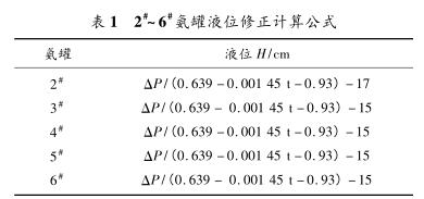 因液氨密度受溫度影響大,且每個氨罐的保溫效果也有差異,故如需準(zhǔn)確測量氨罐液位,必須引入溫度測量。對2#~6#氨罐分別進(jìn)行卸壓,并引入熱電偶遠(yuǎn)傳至DCS系統(tǒng),對密度進(jìn)行修正,修正公式為Q液=0.639-0.00145t。經(jīng)過以上修正,2#~6#氨罐液位修正計(jì)算公式如表1所示。
