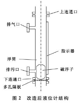 (3)方案3。改造現(xiàn)有的液位計,采用上下端日連接,上過程進日改為排氣口,下過程進日改為排污口,原安裝浮子法鑄和排氣閥接日改為連通日,在下部增加一個多孔隔板,保證浮子不進人工藝管線,同時保證液體的正常流動。在保證不改變液位計結(jié)構(gòu)情況下,將液位計與工藝管線連接。此方案優(yōu)點是花費少,不閑置設(shè)備,并且還能達到液位計與管線清理同步,實現(xiàn)維修與檢修同步。