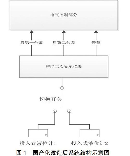 如圖1所示,國產(chǎn)化改造后,地面排水控制系統(tǒng)用防凍液液位計(jì)測量地坑液位,用智能二次儀表接收防凍液液位計(jì)的信號(hào),并根據(jù)設(shè)定的液位報(bào)警值向電氣控制部分發(fā)出啟動(dòng)和停運(yùn)排水泵信號(hào),控制系統(tǒng)配置了2個(gè)防凍液液位計(jì),通過1個(gè)轉(zhuǎn)換開關(guān),可以選擇投入使用的液位計(jì),也可對比兩個(gè)液位計(jì)的測量數(shù)據(jù),通過定期巡檢發(fā)現(xiàn)液位測量故障。