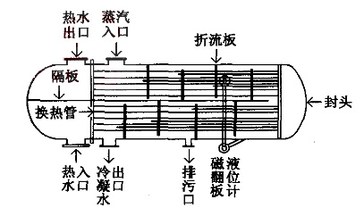 如下圖所示,壓力為0.4~0.6MPa的飽和蒸汽由蒸汽入口進入管式換熱器,經(jīng)折流板、隔板上下流通,*終其大部分熱量被熱水吸收,形成凝結(jié)水從凝結(jié)水出口流出。一次熱水(溫度約為20℃)從熱水入口流進,經(jīng)過從左向右的換熱管流至封頭,在經(jīng)過從右向左的換熱管從熱水出口流出,變成二次熱水,二次熱水流向系統(tǒng),放熱后流回換熱站循環(huán)水泵入口,經(jīng)加壓后再次流向熱水入口,如此反復(fù)循環(huán)加熱,*終向用戶提供80~130℃的高溫熱水。