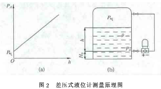 差壓法檢測(cè)液位,是將差壓變送器的高壓室(+)接口與HO液層面相連通,低壓室接口(-)與罐頂氣體空間相連通。通過高低壓室膜盒產(chǎn)生形變的程度與“+”、“-”壓室之間的壓力差值(即△P=P+-P-)測(cè)得差壓。由式(1)和(2)可知: