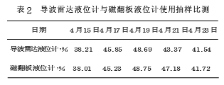 另外,2012年新建20萬t/a合成氨系統(tǒng)2000m³液氨球罐上安裝有一臺(tái)LD51纜式導(dǎo)波雷達(dá)液位計(jì)(位號(hào):LT1201A)和一臺(tái)磁翻板液位計(jì),該信號(hào)均引入DCS顯示。在開始安裝調(diào)試過程中發(fā)現(xiàn)雷達(dá)液位計(jì)與磁翻板液位計(jì)顯示不一致,經(jīng)檢查發(fā)現(xiàn)導(dǎo)波雷達(dá)液位計(jì)取樣管原始高度不正確,經(jīng)重新調(diào)整并對(duì)其相關(guān)參數(shù)進(jìn)行設(shè)定后測(cè)量顯示一致。長(zhǎng)期穩(wěn)定運(yùn)行,給工藝控制提供了準(zhǔn)確數(shù)據(jù),滿足了工藝要求,有效地保障了設(shè)備和人身安全。2014年4月儀表人員抽樣比測(cè)記錄數(shù)據(jù),見表2所示。