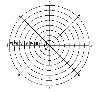 1.2.2 幾何測量法根據(jù)立式金屬罐容量試行檢定規(guī)程,把圓錐體底圓分成M 個同心圓,根據(jù)所分圓環(huán)面積相等條件決定半徑。圓錐體分為一個小圓錐和多個圓臺。在每個圓心圓周測N 個點,即測N 個點到罐底中心的高度。底量測量原理見圖2。