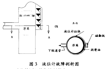 持續(xù)向空貯罐加油至液位計(jì)指示值37%時(shí),用時(shí)約15min。反之,排油液位計(jì)回零用時(shí)大于40min。在其它區(qū)域液位變化則快許多。通過對(duì)氯酸液位計(jì)結(jié)構(gòu)分析,我們發(fā)現(xiàn):圓柱體浮筒(~58mm×280mm)浮在0% ~37%區(qū)間時(shí),形同一個(gè)柱塞擋住了液位計(jì)簡體下部的聯(lián)通管管口(見圖3,