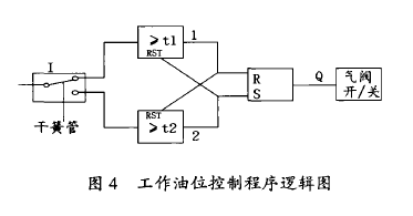 液位計(jì)筒體內(nèi)徑d/~i0mm,標(biāo)尺長750mm。750mm×20%=150mm,280÷750=37.3%),液位計(jì)油位滯后于貯罐油位變化。液位計(jì)回油時(shí),浮筒漂向管口,則阻尼作用更強(qiáng)了,低油位*限開關(guān)LB/LVL6不能及時(shí)動(dòng)作和關(guān)閉氣閥LB/EV2是造成貯油罐泄空而計(jì)算機(jī)未執(zhí)行油位故障處理程序的原因。圖3 液位計(jì)故障剖析圖3.2 液位檢測開關(guān)和控制程序干簧管式接近開關(guān)本身依靠磁控開或合,易受周圍磁場干擾產(chǎn)生誤動(dòng)。現(xiàn)場液位計(jì)安裝位置一側(cè)與電纜橋架相鄰,而另一側(cè)常有行車電磁吸盤吊裝鋼卷作業(yè)。從工作油位控制邏輯過程可以看出(圖4):盡管油位檢測開關(guān)已通,每15s(t1=t2=15s)內(nèi),只要存在一次脈沖干擾,開氣閥電路回路將未被選通。反之亦然。因此,干簧管式接近開關(guān)誤動(dòng)產(chǎn)生錯(cuò)誤控制,也是釀成事故的另一個(gè)原因。