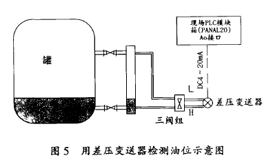 用差壓法檢測油位(△P=p•h)。在上、下聯(lián)通管處開孔取壓,選用智能差壓變送器(*大測量范圍0~10kPa,耐壓力1.6 a,輸出DC 4~20mA,帶顯示表)檢測差壓。標(biāo)定時(shí),取工作用油壓力0~750ram油柱(為保證p值不變)作為輸入,并使表頭指示為0%~100%(線性關(guān)系)即可。差壓變送器輸出信號(hào)接入現(xiàn)場PLC模塊箱PANAL20的模擬量輸入通道,與軋線計(jì)算機(jī)聯(lián)網(wǎng)(見圖5)。