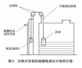 分體式蒸餾水液位計的安裝步驟如下: ①通過計算浮力和配重, 在槽體頂部合適位置安裝定滑輪, 在槽外合適位子安裝磁翻板傳感裝置; ②用直徑為 3 mm 的不銹鋼繩連接浮子和配重, 鋼繩長度根據(jù)液位來計算。這里特別要注意, 磁翻板要反向安裝。