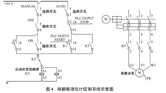 現(xiàn)場安裝丙酸液位計時, 裝置標尺的0 位, 對應的實地高程為EL .40 .0 m 。浮子開關設定5 個水位動作值, 檢修水位低開關量報警值對應的高程為40 .3 m ;停止所有檢修水泵的開關量, 所對應的高程為40 .5 m ;啟動主用檢修水泵的開關量, 所對應的高程為40 .9 m ;啟動檢修水泵主用泵的開關量, 以及要求手動啟動大泵, 并作為水位高報警上送上位機, 所對應的高程為41 .1 m 與41 .2 m , 兩個開關量并列接入。全部開關量分別送入PLC , 如圖3所示。