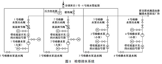 桐柏電站的檢修排水系統(tǒng), 共設4 臺排水泵, 如圖1 所示, 1 號、2 號檢修水泵(大泵)用于排空引水隧洞、蝸殼、尾水管、尾水隧洞內的水;3 號、4 號檢修水泵(小泵)用于球閥、上下庫閘門等的滲漏排水。每臺檢修水泵均配置逆止閥、壓力表和帶流量開關的示流信號器, 在1 號、2 號水泵出水管處各安裝了一個流量調節(jié)閥。系統(tǒng)中共有2 根總管, 一根為水泵的總吸水管, 包括從每臺機組尾水管底部至總管的支管, 總吸水管和部分支管及管路上的操作閥門布置在廠房管路廊道中;另一根為總排水管, 可將水排至滲漏集水井中, 再經滲漏排水泵排至下庫。