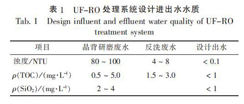 國(guó)內(nèi)某磁翻板液位計(jì)廠, 晶背研磨廢水產(chǎn)生量為 150 ~160 m3 / d, 反洗廢水產(chǎn)生量 為 500 ~ 700 m3 / d, 主要污染物為懸浮物, UF-RO 處理系統(tǒng)設(shè)計(jì)進(jìn)水和出水主要水質(zhì)指標(biāo)見表 1。