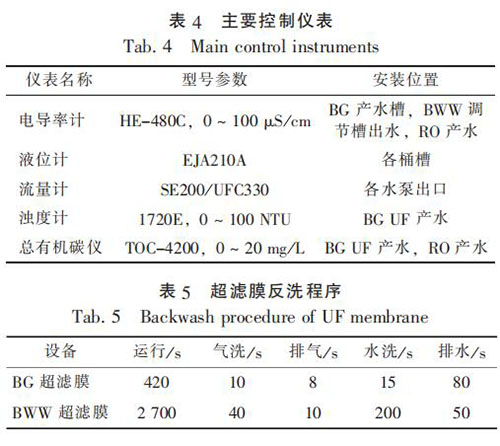 超濾膜組件和反滲透膜組件前均設(shè)置保安過(guò)濾器, 濾芯和膜組件規(guī)格參數(shù)見表 3。