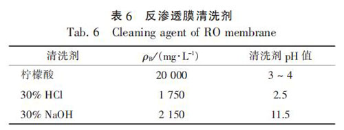 反滲透膜運(yùn)行一定時(shí)間后, 污染物會(huì)在膜表面沉積, 需要定期進(jìn)行化學(xué)清洗以完全恢復(fù)膜性能。 本系統(tǒng)設(shè)計(jì)清洗周期為 3 個(gè)月, 清洗包括循環(huán)、 浸泡、 沖洗 3 個(gè)過(guò)程, 將清洗劑引入反滲透膜 組 , 按 每 支 膜 11.4 L / min 的 流 量 循 環(huán) 5 ~ 15min, 再將單支膜流量調(diào)至 22.8 L / min 循環(huán) 5 ~ 15min, 然后再將單支膜流量調(diào)至 35 L / min 循環(huán) 30 ~60 min, 隨后進(jìn)入浸泡階段, 1 ~ 2 h 后進(jìn)行沖洗,直至濃水電導(dǎo)率與進(jìn)水電導(dǎo)率相同。 反滲透膜采用先酸洗后堿洗的步驟進(jìn)行, 酸洗和堿洗均經(jīng)過(guò)上述過(guò)程, 酸洗劑可選用檸檬酸或 HCl, 堿洗劑選用 NaOH。 清洗劑選擇見表 6。