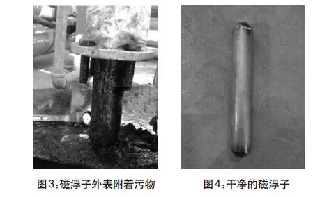 經(jīng)過兩年多運行,污水罐內(nèi)可能沉淀污泥雜質(zhì)導(dǎo)致液位計示數(shù)不準(zhǔn)。現(xiàn)場拆卸液位計,并且對浮球和磁浮子進行清洗。(圖3-圖4)
