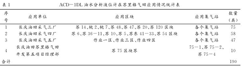 在試驗(yàn)成功的基礎(chǔ)上,蘇里格氣田對 ACD-1DL 油水分析液位計進(jìn)行了全面推廣,截止到 2014年 11 月底,共在 87 座集氣站應(yīng)用 190 臺,各單位應(yīng)用情況統(tǒng)計見表 1 。