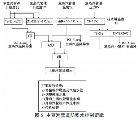 結(jié)合主蒸汽管道積水的上下壁溫差法與疏水罐測(cè)溫法結(jié)合自動(dòng)檢測(cè)方法, 主蒸汽管道防積水可以采用如圖 2 所示中的控制邏輯與策略。