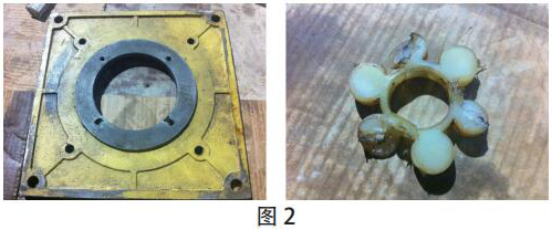 2015 年 9 月 23 日運行過程中,02:15 因“機組高位油箱低油位動作”停機?,F(xiàn)場拆解稀油站 1# 低壓油泵,發(fā)現(xiàn)油泵與底座 2 顆連接螺栓脫落、出油管松脫、底座螺孔拉崩、螺孔周圍多處裂紋、緩沖墊破損等諸多問題。造成油泵無法供油,引起停機。如圖 2 所示。