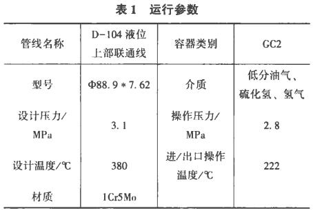 該裝置于2016年9月開工轉(zhuǎn)人正常運(yùn)行,2016年9月7日發(fā)現(xiàn)D-104液面計(jì)上引出線有冒油氣現(xiàn)象,現(xiàn)場(chǎng)檢查發(fā)現(xiàn)D-104液面計(jì)上接管引出線法蘭后焊縫靠上部有裂紋現(xiàn)象,車間對(duì)泄漏部位進(jìn)行帶壓鉚擊消漏處理。9月8日該部位再次出現(xiàn)泄漏,裝置停工隔離處理(表1)。