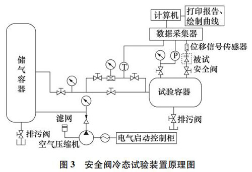 安全閥冷態(tài)試驗(yàn)裝置( 見(jiàn)圖 3) 主要由壓縮氣源、儲(chǔ)氣罐、節(jié)流控制閥、試驗(yàn)罐、閥門(mén)和管道、數(shù)據(jù)采集系統(tǒng)、控制系統(tǒng)等組成,可對(duì)公稱壓力 PN≤20 MPa,公稱通徑 DN≤150 mm 的安全閥進(jìn)行整定壓力試驗(yàn)、排放壓力試驗(yàn)、回座壓力試驗(yàn)、開(kāi)啟高度試驗(yàn)、排量及排量系數(shù)試驗(yàn),檢測(cè)參數(shù)和自動(dòng)化程度達(dá)到國(guó)內(nèi)**水平。