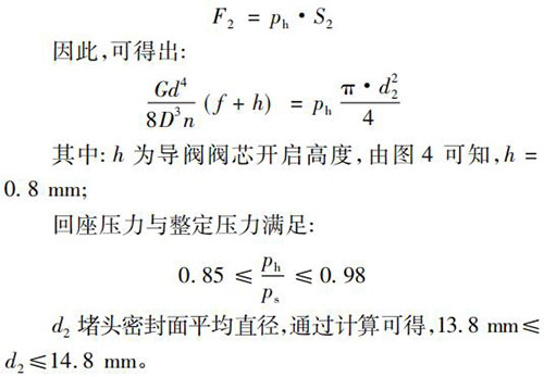 當(dāng)系統(tǒng)壓力降低到回座壓力時(shí),導(dǎo)閥彈簧要克服堵頭密封面處的密封力將其打開(kāi),此時(shí)應(yīng)滿足: