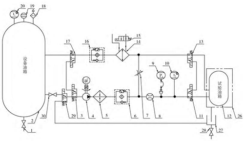油液供油:原理中油液經吸油開關(30)、L 形三通電動閥(3、29)、油泵(4)、加熱器(5)、供油過濾器(6)、流量計(8)、L 形三 通 電 動 閥(11)后進入被測油箱,然后 經 L形三通電動閥(13)、油水換熱器(14)、回油過濾器(16)、L 形三通電動閥回到設備油箱中,此條支路可提供被測油箱剛安裝于試驗臺上時的油液供給,通過流量計軟件計時的方法判斷補油量。