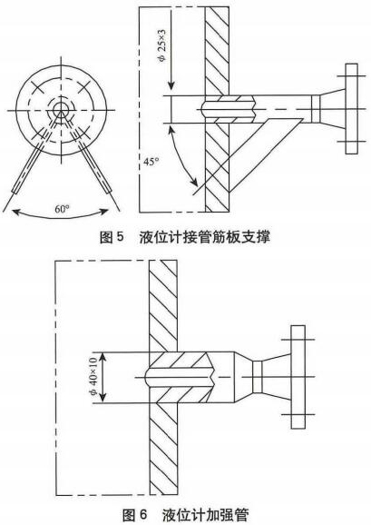 圖5是泄漏丙酸液位計(jì)接管結(jié)構(gòu),雖然必25mmx35mm接管的開孔補(bǔ)強(qiáng)滿足GB150-1989標(biāo)準(zhǔn)[11“開孔不另行補(bǔ)強(qiáng)”的要求,但卻不符合現(xiàn)行標(biāo)準(zhǔn)GB/T150-2011的“開孔不另行補(bǔ)強(qiáng)”要求。因?yàn)?,兩?biāo)準(zhǔn)雖然限制的設(shè)計(jì)壓力(<2.5MPa)與接管外徑(<89mm)等條件相同,但是后者改版標(biāo)準(zhǔn)卻對(duì)接管壁厚及腐蝕裕量增加了要求,這是合理的改進(jìn)完善。對(duì)于本例的425mm接管,滿足GB/T150-2011的“開孔不另行補(bǔ)強(qiáng)”條件的管壁厚度至少應(yīng)為5.5mm(按標(biāo)準(zhǔn)規(guī)定當(dāng)腐蝕裕量為1mm時(shí),接管厚度應(yīng)不小于3.5mm)。所以,按HG/T20583-2011對(duì)小接管避免彎曲而推薦的加強(qiáng)結(jié)構(gòu)優(yōu)先選用加強(qiáng)管形式建議將液位計(jì)接管更改為圖6的加強(qiáng)管結(jié)構(gòu)。這樣不但解決了小接管的開孔補(bǔ)強(qiáng)和防彎曲加強(qiáng)問(wèn)題,也可以使小接管的設(shè)計(jì)使用年限與罐體一致,而且便于保證小接管與罐體采用插人式全焊透角焊縫的焊接質(zhì)量。