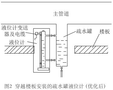 液位計測量桿反向安裝后,變送器和接線盒位于樓板上部,反裝后示意圖如圖2所示。維護(hù)時變送器位于接近地面的位置,易于到達(dá),不存在高處作業(yè)風(fēng)險,不需要搭建腳手架,工作流程也能得到簡化。