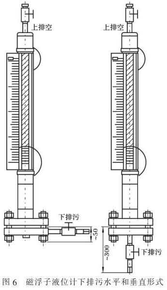 以常用防腐磁翻柱液位計為例。 此類液位計安裝時,一般選用側(cè)-側(cè)連接方式,帶放空和排污。因此, 應根據(jù)預留空間, 決定放空或排污采用垂直(常用)或水平的安裝形式,如圖 6 所示。