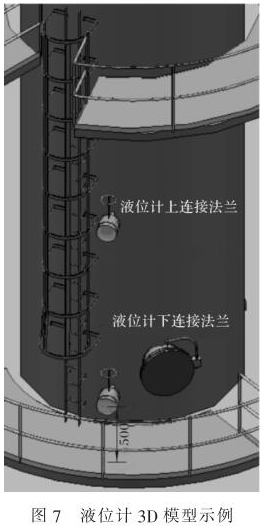 如圖 7 所示,以某項目的 3D 模型為例,防腐磁翻柱液位計下連接法蘭距離平臺 0.5m , 該防腐磁翻柱液位計下法蘭至下排放口(常用垂直形式)約為 0.57m ,為避免平臺開孔,應選擇下排污為水平的形式,約為 0.32m。因此,在設計階段,應通過 3D 模型核對每臺液位儀表的安裝位置及空間, 選擇合理的液位計安裝形式,避免施工時儀表安裝不下。
