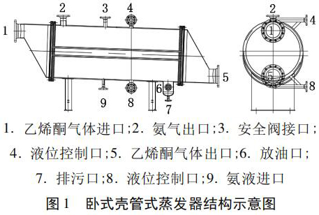 廣西某化工實業(yè)有限公司購進了四臺靖江容器制造有限公司生產(chǎn)的換熱面積為 26. 3 m3 的臥式殼管式蒸發(fā)器,廠家提供的結構示意圖見圖 1,主要用于冷卻乙烯酮氣體,要求四臺臥式殼管式蒸發(fā)器出口的乙烯酮氣體溫度依次為 - 5℃、- 10℃、- 15℃、 - 20℃,以分離出乙烯酮氣體中的水和醋酸,并防止結冰。