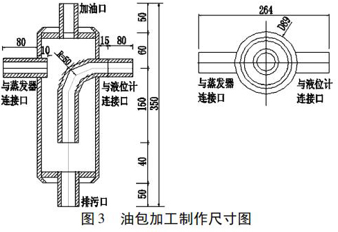 1. 現(xiàn)場加工制作油包。油包式液位計包括油包和防霜磁翻板液位計兩部分,通 過 管 道、閥 門 連 接 而成。油包是油包式液位計的關鍵部件,容積過小或與防霜磁翻板液位計連接不符合要求,有可能造成液位上升、下降緩慢,液位反應不靈敏,或者油包結霜。圖 3 為油包加工制作尺寸圖,現(xiàn)場加工按圖紙要求制作。