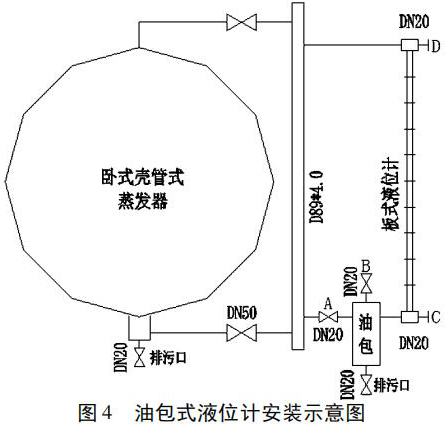 3. 安裝油包式液位計。根據(jù)現(xiàn)場的臥式殼管式蒸發(fā)器的實際情況,繪制了油包式液位計安裝示意圖( 圖 4) ,在排污口通向大氣、安全員現(xiàn)場監(jiān)督的情況下,實施焊接、安裝。