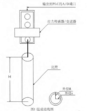 沉筒式液位計(jì)主要由拉力傳感器、變送器及沉筒組成,拉力傳感器內(nèi)部貼有電阻應(yīng)變片,通過信號線將變送器輸出的標(biāo)準(zhǔn)電流信號送到PLC的A/D輸入端口,用以進(jìn)行數(shù)據(jù)處理和遠(yuǎn)程控制。沉筒由上下兩端封閉的空心材料制成,并懸掛在拉力傳感器的受力端,其余部分投入到儲料罐中,拉力傳感器用法蘭盤或自帶螺紋固定在儲料罐的上方,結(jié)構(gòu)如圖1所示。