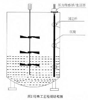 在某些工業(yè)材料的制備過程中需要用到攪拌使材料混合均勻,達(dá)到工業(yè)用料的要求。即使液體始終處于攪拌狀態(tài)下,液體表面波動(dòng)較大,罐體還有明顯的震動(dòng),再加上蒸汽、粉塵等比較惡劣的環(huán)境,傳統(tǒng)的液位檢測裝置無法正常工作。利用這種沉筒式液位計(jì)能很好的解決這一問題,并且能夠通過軟件去除誤差相對較大的數(shù)據(jù),保證檢測的精確性,其檢測結(jié)構(gòu)如圖2所示。
