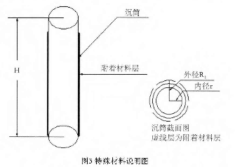 當(dāng)材料本身有粘附性和凝固性時(shí),沉筒的表明會附著一層或幾層材料,導(dǎo)致其體積發(fā)生變化,自身的重量也發(fā)生變化,其變化如圖3所示,其中沉筒截面積中虛線層為附著材料層,設(shè)此時(shí)沉筒外徑為R1。