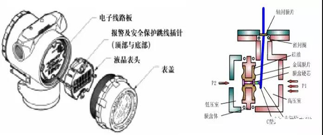 鍋爐差壓式液位計(jì)結(jié)構(gòu):主要部件為傳感器模塊、電子元件外殼、毛細(xì)管、高低壓側(cè)法蘭及膜片。傳感器模塊包括充油傳感器系統(tǒng)(隔離膜、充油系統(tǒng)和傳感器)以及傳感器電子元件。