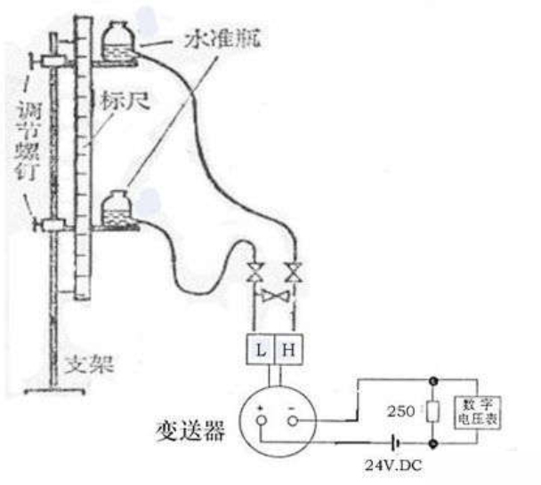 當液體密度恒定時,測出差壓就就可知道液位高度,而與液體容積無關,或者說知道了液體高度,也就知道了差壓,即△P=ρH。模擬校驗法就是基于上述原理進行的?,F(xiàn)以校驗水位計為例,介紹一下具體方法,校驗裝置及接線如圖所示: