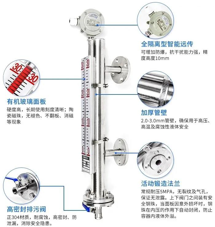 磁性液位計是根據(jù)連通器和帶磁藕合基本原理而工作中的。做為一種普遍的液位儀檢測儀表,被普遍用于石油化工設備、倉儲物流運送等制造行業(yè)對各種各樣儲槽、儲罐、球形器皿和加熱爐等機器設備內的物質開展液位儀檢驗。相關磁性液位計的基本原理,大家都廣為人知,但對其構造和特性卻了解很少。那麼,磁性液位計的構造構成和特性有什么呢?