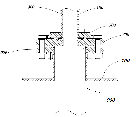 針對傳統(tǒng)頂裝式海水液位計(jì)的這些弊端,在多次試驗(yàn)的基礎(chǔ)上,對現(xiàn)有的內(nèi)襯工藝與結(jié)構(gòu)做了改進(jìn),發(fā)明了頂裝式海水液位計(jì)的一種新工藝及其結(jié)構(gòu),如下圖所示,其提供了*一連接件和連接內(nèi)襯。該連接內(nèi)襯具有用于連通內(nèi)襯連接口的*一連接口、自*一連接口向外成環(huán)形設(shè)置的*一密封部、用于與被測容器連通的*二連接口和自*二連接口向外成環(huán)形設(shè)置的*二密封部。由于該*一連接件和連接內(nèi)襯為單獨(dú)設(shè)置,可以單獨(dú)制造,因此*一密封部和*二密封部可以制作的足夠大,從而實(shí)現(xiàn)*一密封部與浮筒內(nèi)襯的翻折部密封抵接;同時,連接內(nèi)襯的*二密封部用于與容器實(shí)現(xiàn)密封連接。由此,該連接內(nèi)襯可以與浮筒內(nèi)襯和容器開口內(nèi)的護(hù)筒形成完全密封的連接,從而避免連接處的金屬面受腐蝕,使生產(chǎn)安全順利地進(jìn)行,免受因發(fā)生生產(chǎn)安全事故對生命和財(cái)產(chǎn)造成的安全威脅。