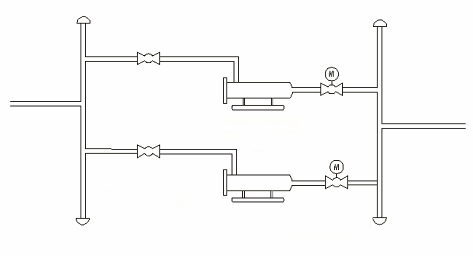 在輸氣站場根據(jù)下游用戶年設計輸氣量及檢維修需求通常設置兩臺臥式過濾分離器,運行時通常采用一用一備方式運行,氣量需求高峰時段達到單臺處理量時兩臺同時運行以滿足用戶氣量需求。過濾分離器在整個輸氣站場工藝流程中通過法蘭與管道相連,同時上下游均設置球閥(見圖1),其中下游球閥與電動執(zhí)行機構(gòu)相匹配使用,能實現(xiàn)遠程開關(guān)控制。在正常運行狀態(tài)下,在用過濾分離支路的上下游球閥處于完全開啟狀態(tài),備用過濾分離支路的上游球閥處于開啟狀態(tài),下游球閥處于關(guān)閉狀態(tài)。對于過濾分離器切換有兩種方式:一種是手動模式,另一種是自動模式。在手動模式下可由操作人員通過遠程和就地狀態(tài)下實現(xiàn)過濾支路流程切換;當在自動模式下電動閥產(chǎn)生事故關(guān)斷時,則報警并自動選擇備用設備,打開備用支路的電動閥,關(guān)閉當前支路的電動閥門,實現(xiàn)工作分離器和備用分離器的切換,上述過程由程序自動完成,不需人為干預。