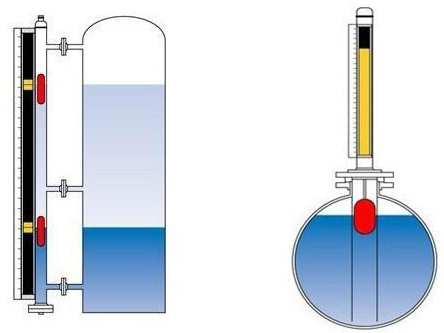 磁翻板液位計(jì)(也可稱為磁性浮子液位計(jì))根據(jù)浮力原理和磁性耦合作用研制而成。當(dāng)被測(cè)容器中的液位升降時(shí),液位計(jì)本體管中的磁性浮子也隨之升降,浮子內(nèi)的永久磁鋼通過(guò)磁耦合傳遞到磁翻柱指示器,驅(qū)動(dòng)紅、白翻柱翻轉(zhuǎn)180°,當(dāng)液位上升時(shí)翻柱由白色轉(zhuǎn)變?yōu)榧t色,當(dāng)液位下降時(shí)翻柱由紅色轉(zhuǎn)變?yōu)榘咨?,指示器的紅白交界處為容器內(nèi)部液位的實(shí)際高度,從而實(shí)現(xiàn)液位清晰的指示。